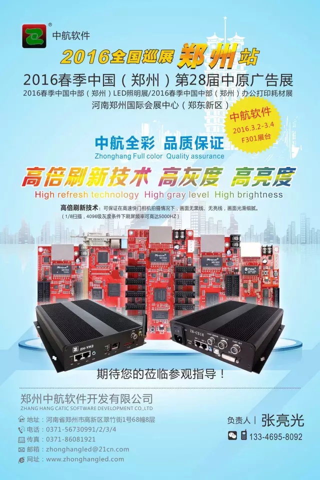 在接下來(lái),中航軟件2016年全國巡展-鄭州站展覽會(huì )上,中航軟件將展示的產(chǎn)品系列有:全彩同步系列,全彩異步系列,門(mén)楣全彩,全面升級第六代WIFI系統,GPRS系列等。誠邀您蒞臨中航展臺,把握中部崛起的時(shí)機,乘坐中原交通網(wǎng)、陸上絲路,攜手鑄造2016年新輝煌!