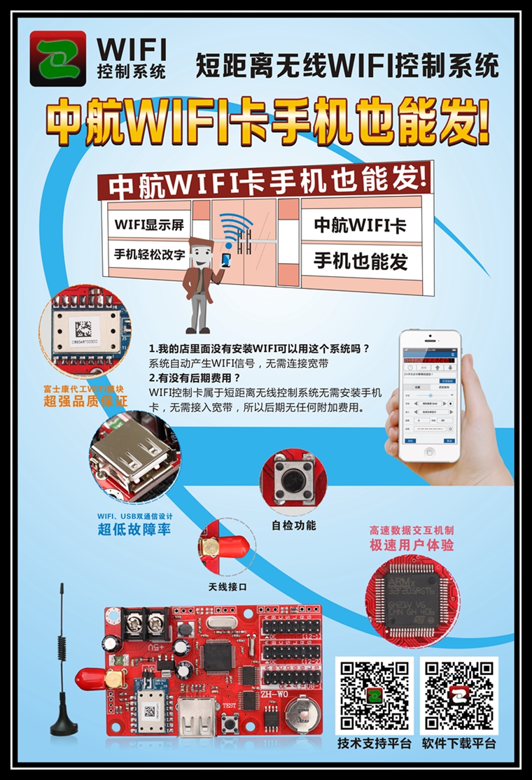 我公司推出V3WiFi控制系統,軟件操作簡(jiǎn)單好用,免布線(xiàn)、免U盤(pán)、無(wú)需連接寬帶,更無(wú)后期任何附加費用,高質(zhì)量方案,更容易被行業(yè)人員所接受使用,我們相信中航無(wú)線(xiàn)WiFi控制系統正在創(chuàng )造另一個(gè)神話(huà)——無(wú)線(xiàn)WiFi控制卡取代U盤(pán)控制卡成為市場(chǎng)主流產(chǎn)品。