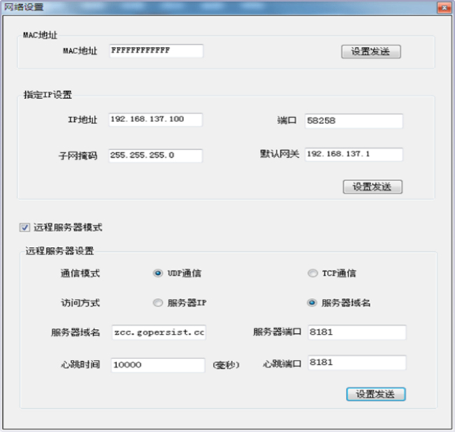 遠程服務(wù)器設置可以選擇IP或者域名;公司搭建的云服務(wù)器一律設置域名,且服務(wù)器端口、心跳時(shí)間也不可改變;用戶(hù)搭建的服務(wù)器建議使用IP,端口可改變。