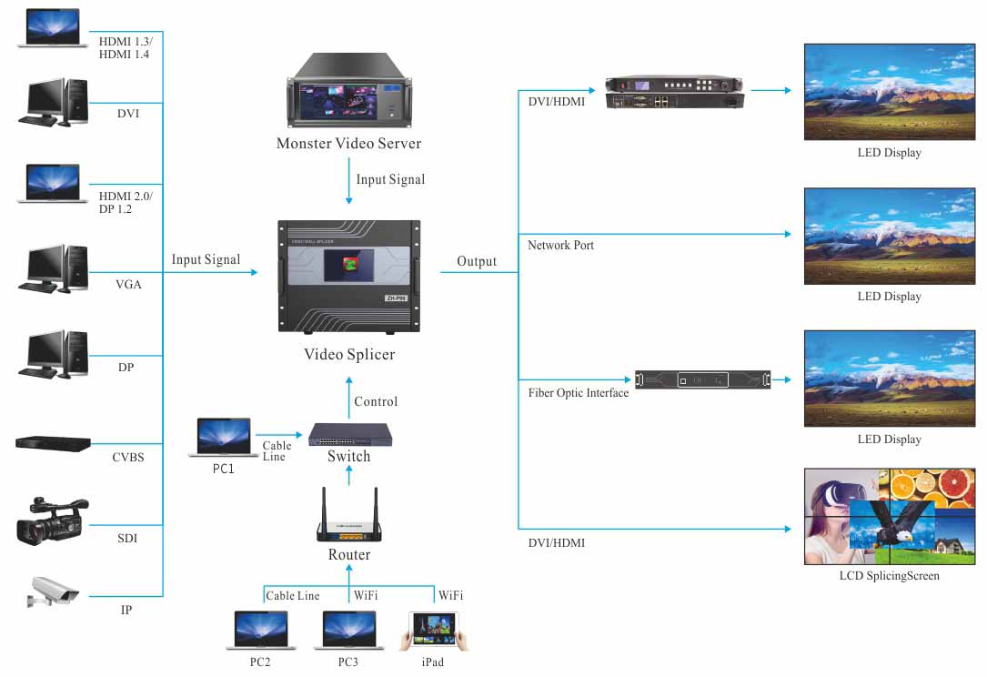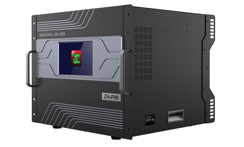 ZH-P90 video splicing server is a new high-performance video image processing system with pure hardware architecture and no operating system launched by ZH company to cater to the high-resolution and small-pitch market. It can display multiple dynamic images on multiple screens, realize the function of multi-window splicing. It is widely used in water conservancy, electric power, meteorology, enterprises, production, education, banking, transportation, radio and television, military stages, leasing and other fields.